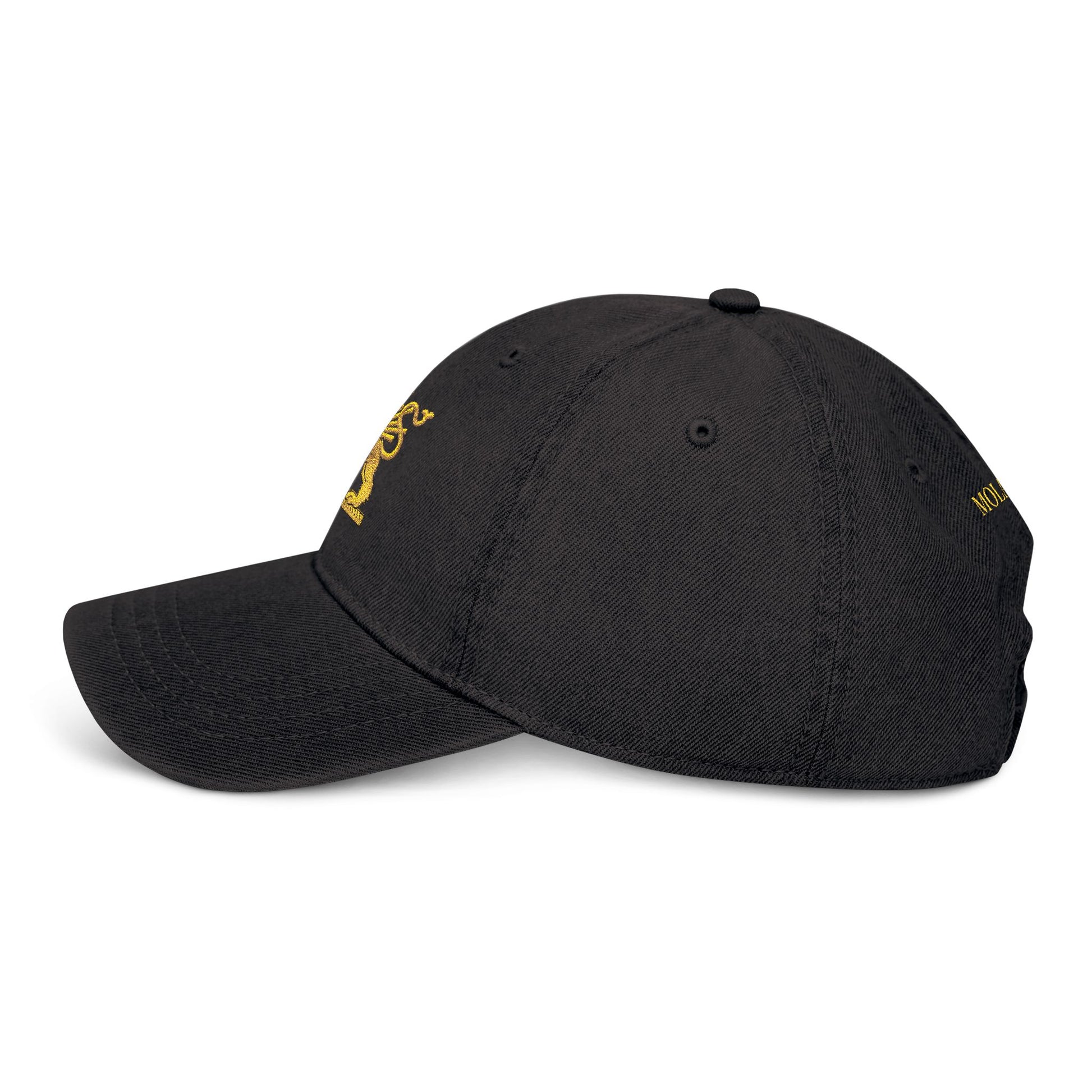 - Gold embroidery front emblem with matching stitched text at the back